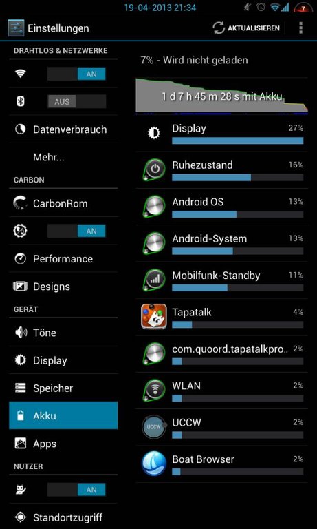 ich muss sagen, dass ich meine Meinung über den Idledrain revidieren muss. Unter der Slimbean ROM läuft das Ding viel besser! Habe über Nacht 2% verloren. Verbrauch von 0,2% pro Stunde laut BBS. Ein Topwert wie ich finde