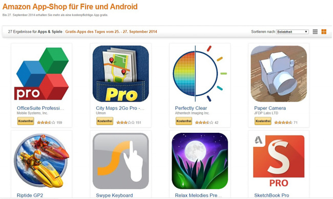 Amazon hat statt der üblichen Gratis-App des Tages mal wieder eine größere Rabattaktion gestartet, bei der für 24 Stunden 27 Android-Apps kostenfrei angeboten werden. Die Apps können wie üblich über die Werbversion, auf einem Kindle-Gerät, oder aber über den Appshop für Android bezogen werden. Kostenlos zu haben sind zum Beispiel City Maps 2Go Pro, OfficeSuite Professional 7, Paper Camera, Terminplaner Pro, mSecure Password Manager, Riptide-GP2, Sonic The Hedgehog 4 Episode II, Swype und viele mehr.Solltet ihr den Amazon App-Shop noch nicht auf eurem Android-Gerät installiert haben, könnt ihr ihn unter diesem Link herunterladen.
