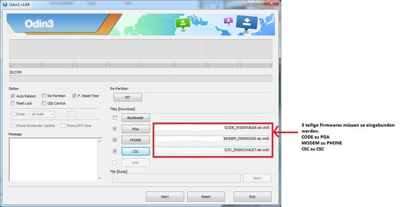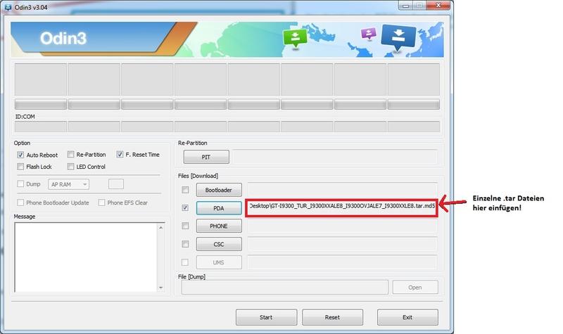 7. Achtet darauf, dass bei Odin nur bei "Auto Reboot" und "F.Reset Time" ein Haken gesetzt ist und sonst nichts!