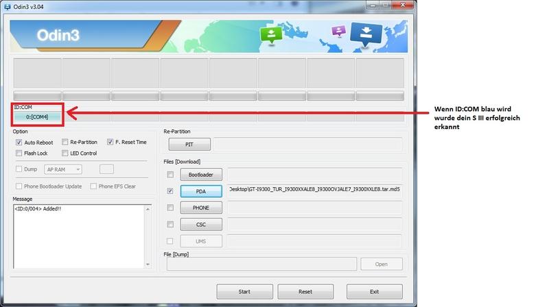 6. Steckt euer Handy per USB an den PC an. Bei Odin müsste jetzt links oben ID:COM aufleuchten. Welche Zahl neben dem COM steht, ist völlig unwichtig.