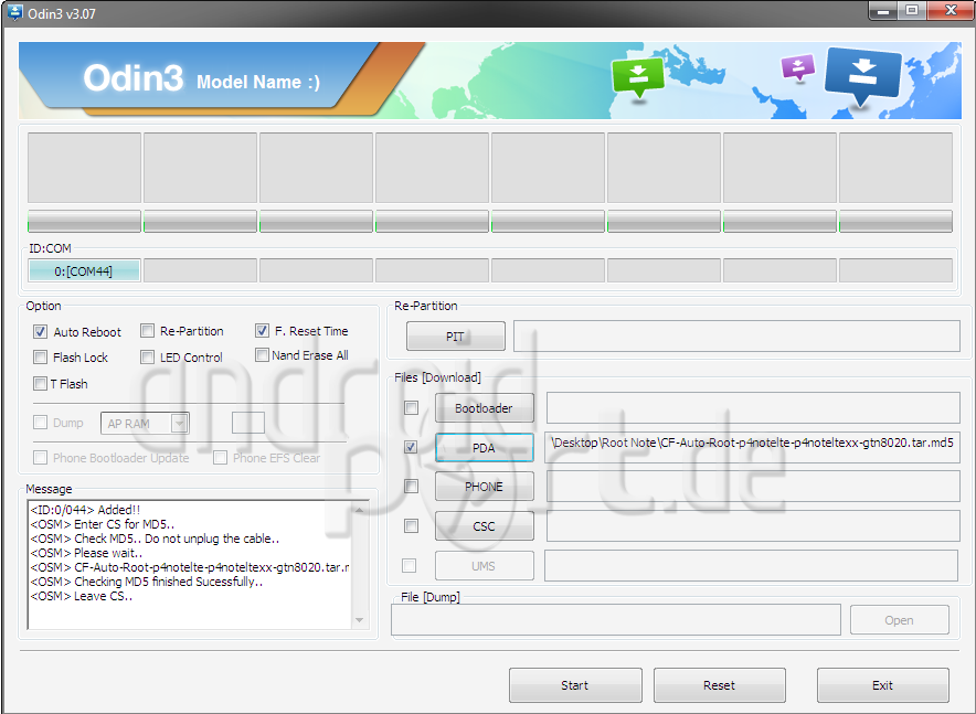 4. Starte aus dem entpackten Ordner Odin.exe und verbinde dein Tablet mittels mitgeliefertem Kabel mit dem PC