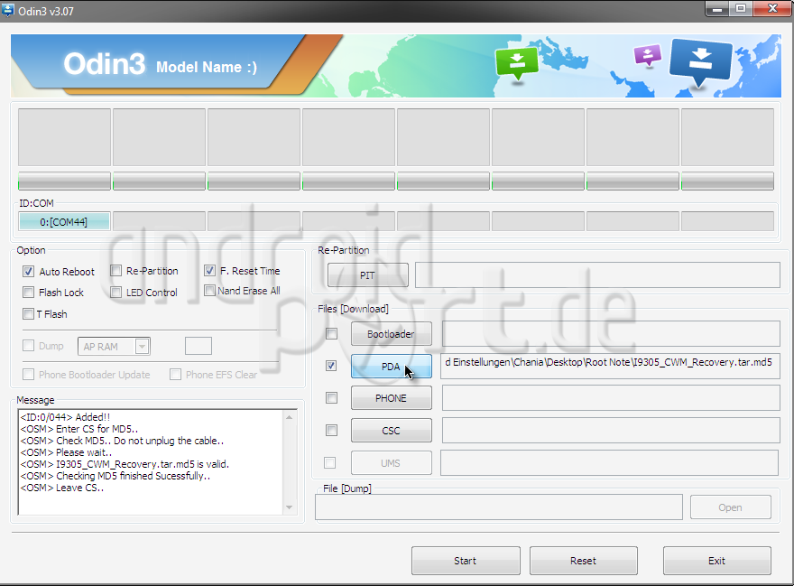 4. Starte aus dem entpackten Ordner Odin.exe und verbinde dein Smartphone mittels mitgeliefertem Kabel mit dem PC. Das blaue Kästchen links zeigt einen com-Eintrag, wenn das S3 LTE erkannt wurde (siehe Bild)