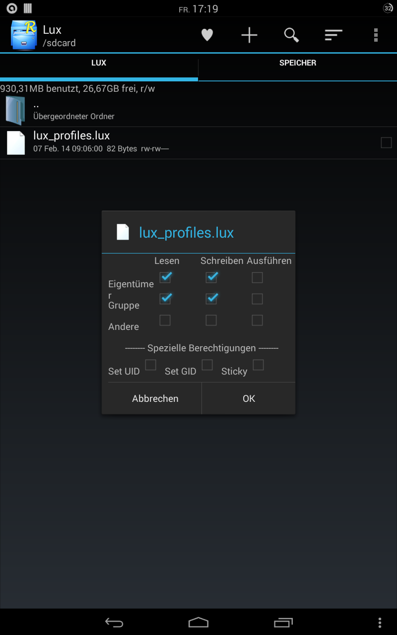 - mit einem Rotfähigen Explorer nach, SDCard >>> Lux Ordner kopieren und das bestehende Profil ersetzen,Rechte setzen wie auf meinem Screen zu sehen.