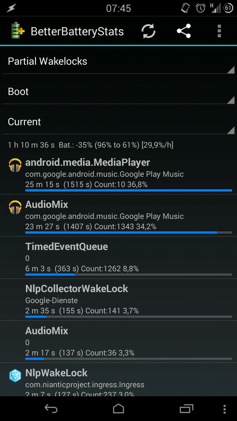 Der msm_serial_hs_dma kommt auch vom Bluetooth.CodeI’ve had the problem that the device didn’t want to switch into deep sleep mode if radio was on. What is deep sleep? To make it simple we break it down. Your device has 3 modes. The fisrst is “Screen On and Awake”, “Awake” and “Deep Sleep”. If you use your device it you’re in the first mode and you need a obviously a lot of battery. The second “Awake” means it is doing some background work. Checking for calls, checking Emails, syncing contacts. The last one means it goes for some time into a mode were it uses almost no battery, and this is Deep Sleep. If you don’t do anything and your phone is in your pocket you want that it is in the Deep Sleep mode most of the time. My HTC Wildfire S didn’t want to go into the “Deep Sleep” mode at all if radio was turned on. It worked with Airplane mode. I thought this has something todo with RIL but I was wrong. Actually it was a bluetooth wakelock. The wakelock “msm_serial_hs_dma” was held all the time. The problem is that the msm7227 platform doesn’t supports quick switch-on/off of the bluetooth module and you need to deactivate it with an overlay else ICS always tries to trigger it. So adding <bool name="config_bluetooth_adapter_quick_switch">false </bool> to overlay/frameworks/base/core/res/res/values/config.xml fixed the problem and the wakelock was gone.Und vom Verständnis her würde ich sagen, dass das N5 während der Audio-Wiedergabe über Bluetooth nicht in den Tiefschlaf wechseln kann.