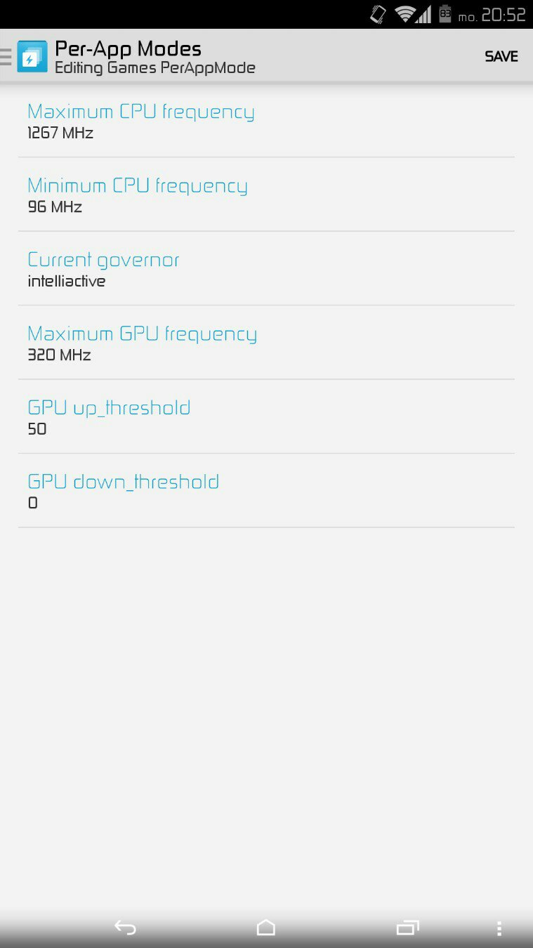 Ich nutze per APP Modes nicht mehr. Bei mir kommts immer zu Problemen. Touch Boost Frequenz, sowie dauer sind bei mir standard. Das einzige was ich für tapatalk, hangouts, facebook usw. hatte, was das begrenzen auf 2 Kerne und nur bis 1.5ghz getaktet.