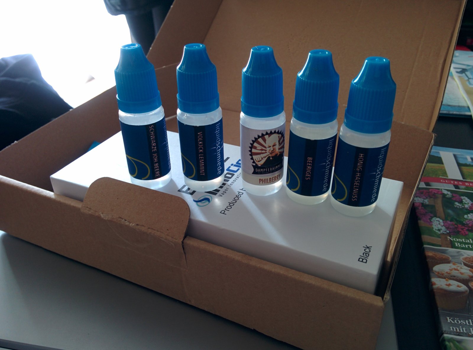 Von den 5 Liquids habe ich bisher nur 2 Probiert und die sind cool: Philberry (Minze/Erdbeere) und Tabak/Haselnuss/Honig -
