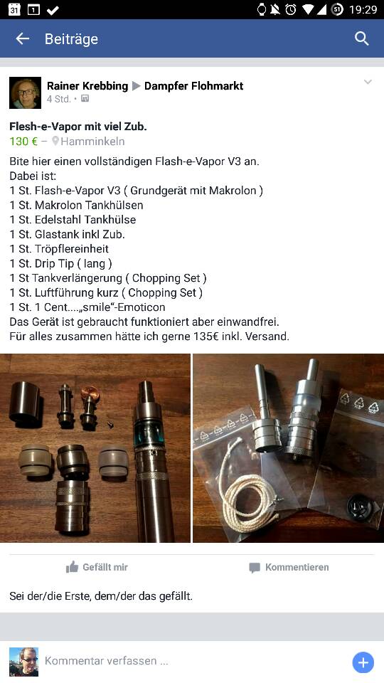 Schönes Hobby das Dampfen, Technik und Genuß vereint. Und gesundheitlich geht es mir auch besser als mit den PyrosZu Facebook: man muss den Verkäufer vertrauen können. Bei dem jetzt habe ich kein schlechtes Gefühl, sehr nett und wir quatschen seit über zwei Stunden über das Dampfen