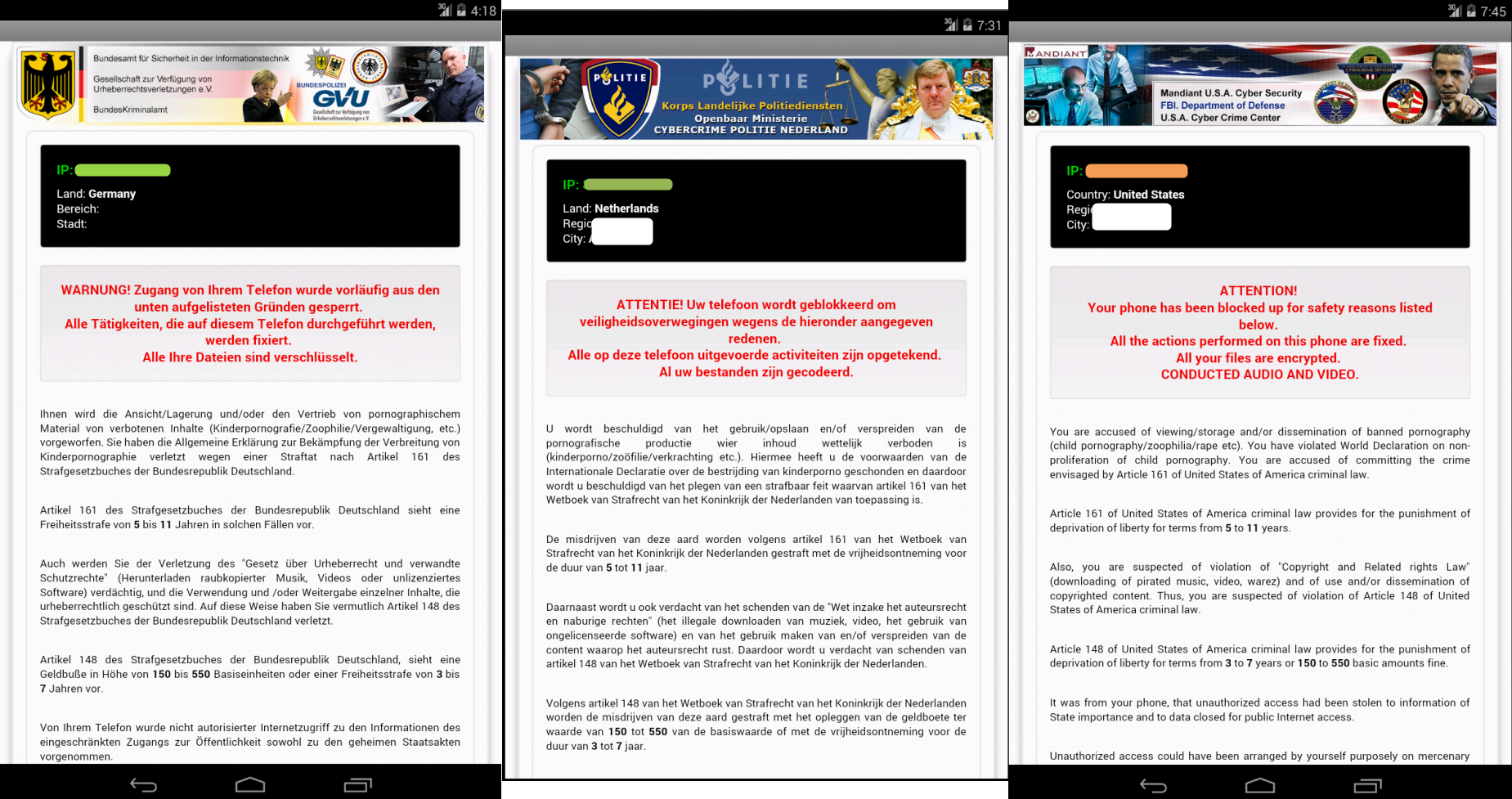 Wie auch bei Windows setzen die Kriminellen auf die Angst der Nutzer. Opfer bekommen eine landesspezifische Meldung angezeigt die sie zur Kasse bittet, mit den jeweiligen Bildern der Justizbehörden sodass es echt aussieht.