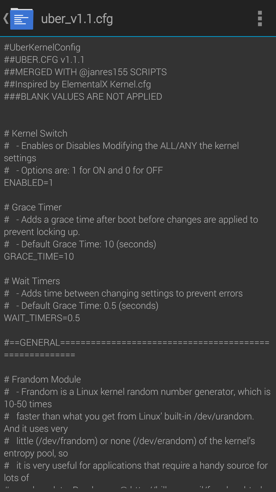 ...ich denke dem einem oder anderem ist in den Changelogs bestimmt aufgefallen das Chet nun: Kernel Einstellungen ähnlich dem ElementaX Kernel hat. ( uber_v1.1.cfg )