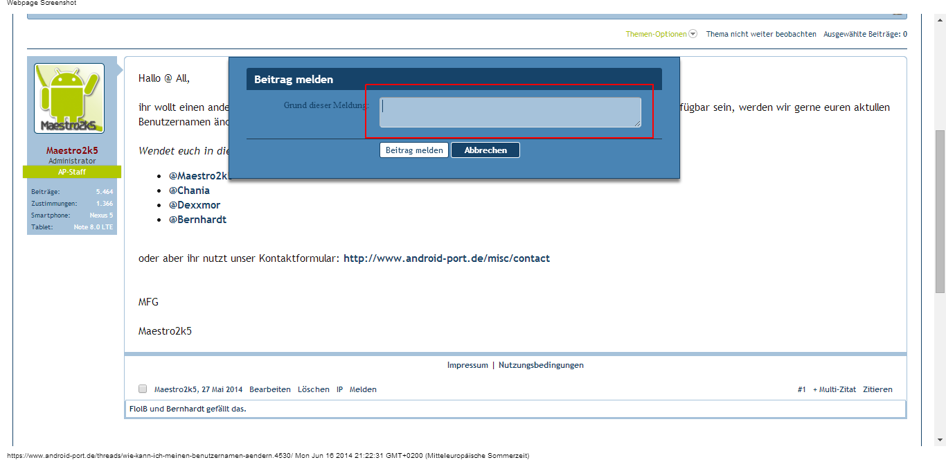 2. Gebt nun im Textfeld (im Screenshot rot markiert) einen Grund ein und klickt auf Beitrag melden.