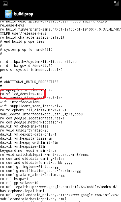 Das rot umrandete ist das einzig interessante für uns. Nicht wundern, dass da bei mir 182 steht, da meine Density schon geändert wurde. Bei euch sollte bei einer jungfräulichen build.prop 240 stehen.