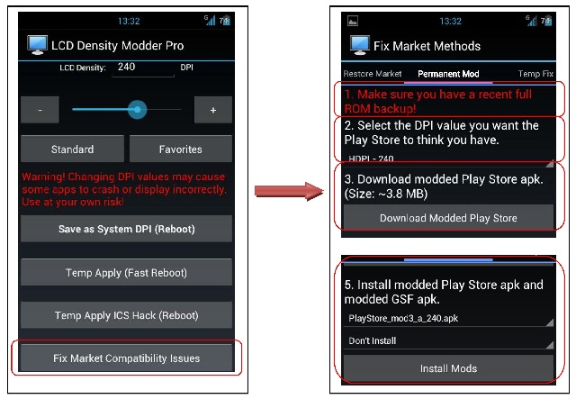 Damit die volle Marketkompatibilität auch nach der DPI-Änderung noch gegeben ist muss man einen gemoddeten Market installieren.