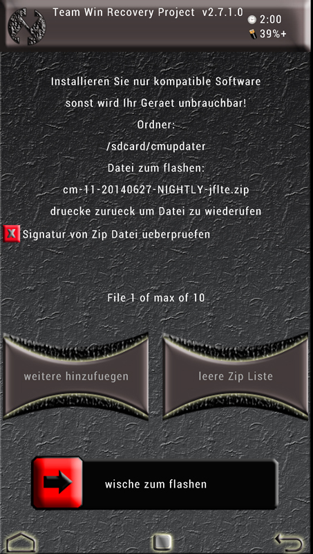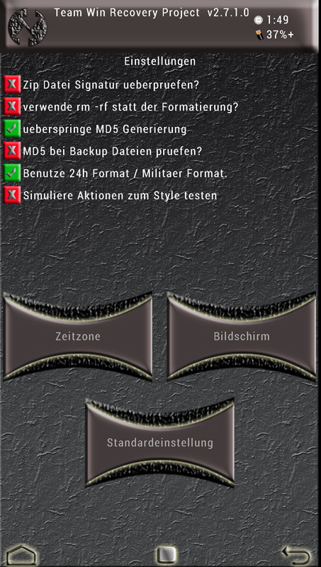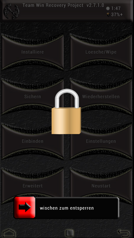 [COLOR=Red]Hinweis: Wird bei TWRP ein neuer Menüpunkt, Button oder Effekt hinzugefügt, muss das Theme angepasst bzw. erweitert werden, damit auch im deutschen Theme der neue Menüpunkt, Button oder Effekt angezeigt wird. Das hängt damit zusammen weil die Button/Menüpunkte etc. aus einer xml-Datei ausgelesen werden.