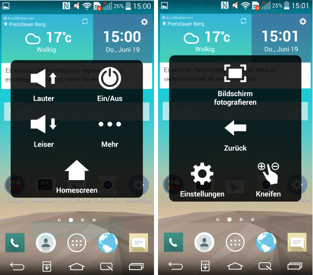 Wichtige Funktionen wie die Regelung der Lautstärke, Ein/Aus, Homescreen, Einstellungen oder Zurück können über einen Extra-Button erreicht werden, der auf jedem Bildschirm sichtbar ist und per Drag and Drop beliebig platziert werden kann. Hierzu wählt Ihr bei den Eingabehilfen die Option Universal touch. Ein Tipp auf den jetzt erscheinenden Button öffnet die Basisfunktionen über dem aktuellen Bildschirm.