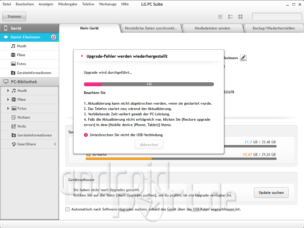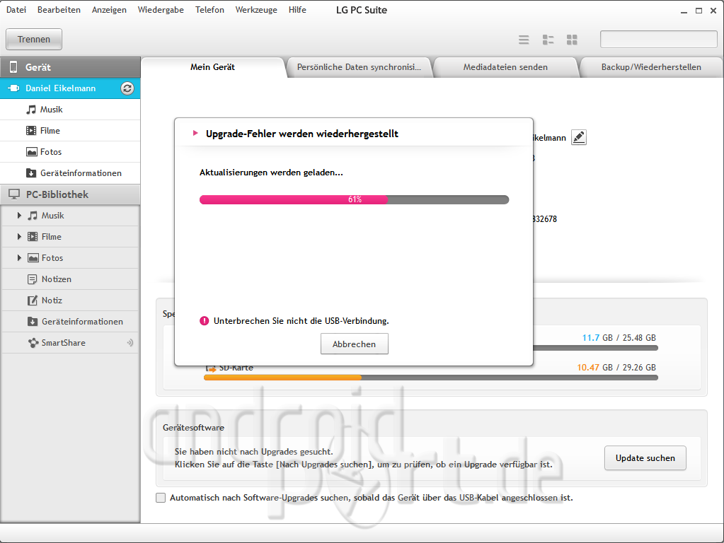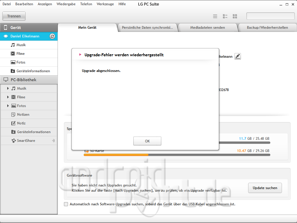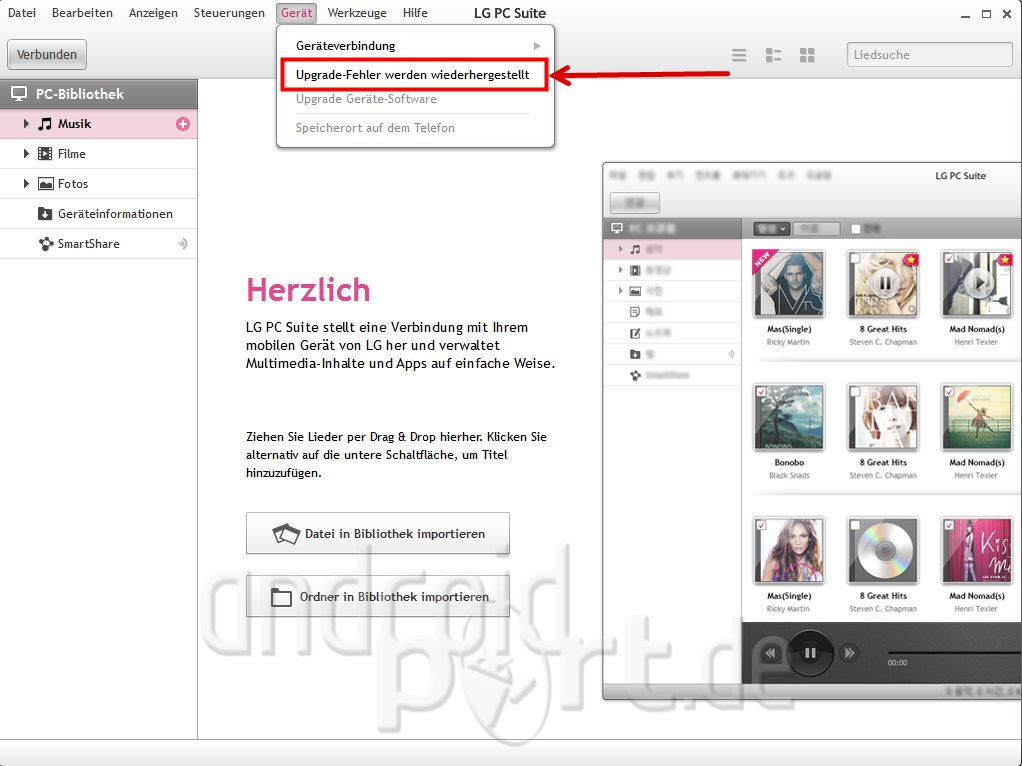 - Wenn das G3 verbunden ist gehe zu "Gerät" Menü in der PC Suite und wähle die Option [COLOR=#ff0000]Upgrade Fehler werden wieder hergestellt[/COLOR]