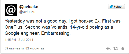 Even Blass , bekannter auch als @evleaks hat Fehler bei den Informationen zum Nexus 9 und OnePlus Tab eingeräumt. Erstmal Hut ab vor der Leistung, andere hätten es sicher nicht so gemacht wie Even Blass und sich in aller Öffentlichkeit entschuldigt. Als ich gestern noch die News zum neuen Nexus 9 schrieb schien es noch so, als würde ein wahres Tabletwunder auf uns zukommen. Im Grunde sind die Infos richtig nur, stimmen laut Even Blass die technischen Daten mit 5 GB Ram und 64 GB internen Speicher nicht. Even Blass gab nun nämlich via Twitter zu, dass beide Infos zu der Hardware des Nexus 9 und OnePlus Tab nicht stimmen. Das es beide Geräte geben wird, hingegen schon. Even Blass war eben nun so mutig und hat sich öffentlich bei allen via Twitter entschuldigt und gleich dazu klargestellt, dass er von einem 14 jährigen getrollt wurde, der sich als Google Mitarbeiter ausgegeben hatte.