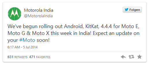 Motorola hat nun den Rollout auf Android 4.4.4 für das Moto X, Moto G und Moto E in Indien gestartet. Motorola hat somit bewusst Android 4.4.3 übersprungen, was zu viel Unmut bei den Moto-Besitzern geführt hat. Als Gründe wurden u.a. die Open SSL Lücke genannt, die von Goggle mit 4.4.4 behoben werden sollte.