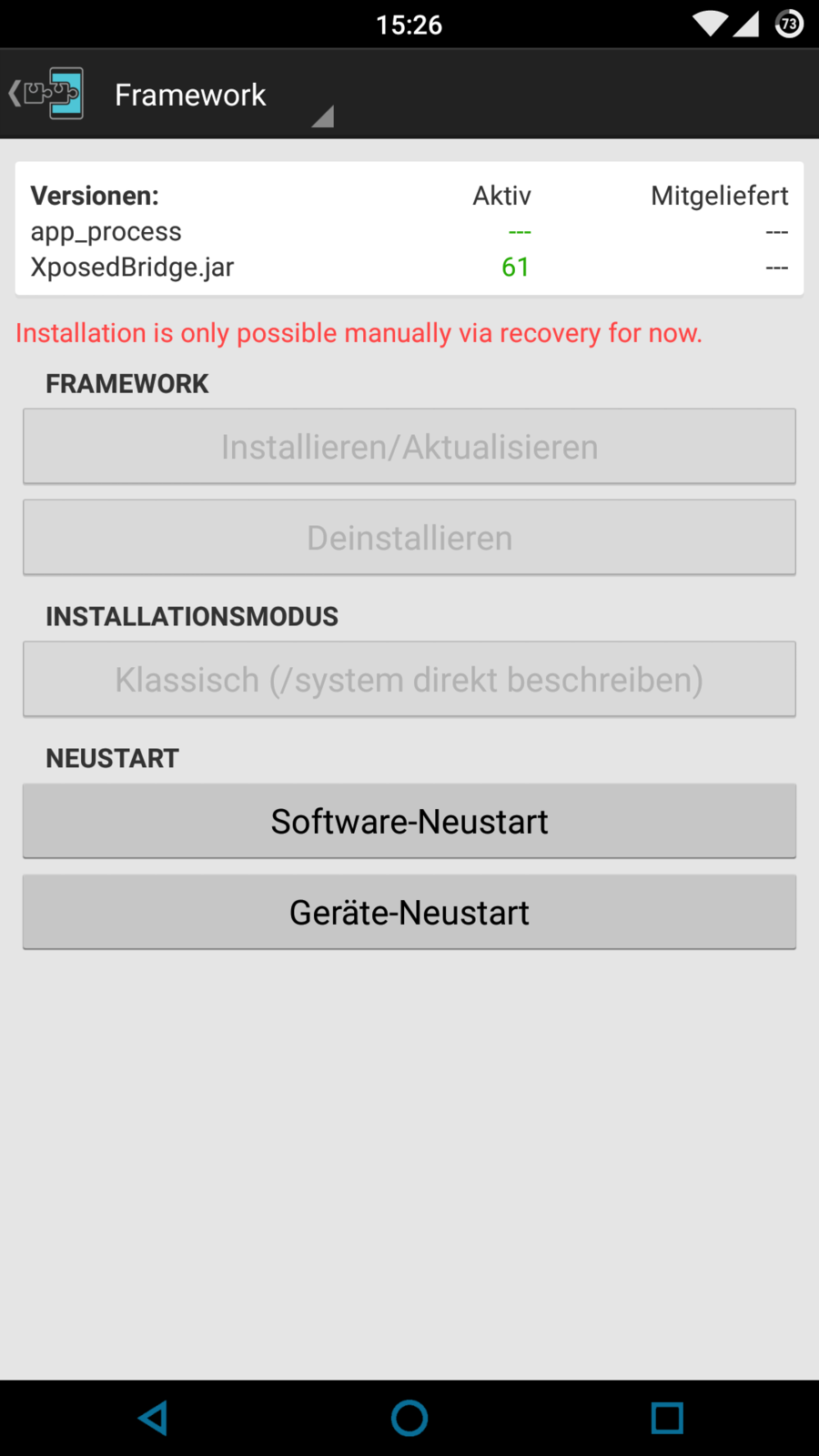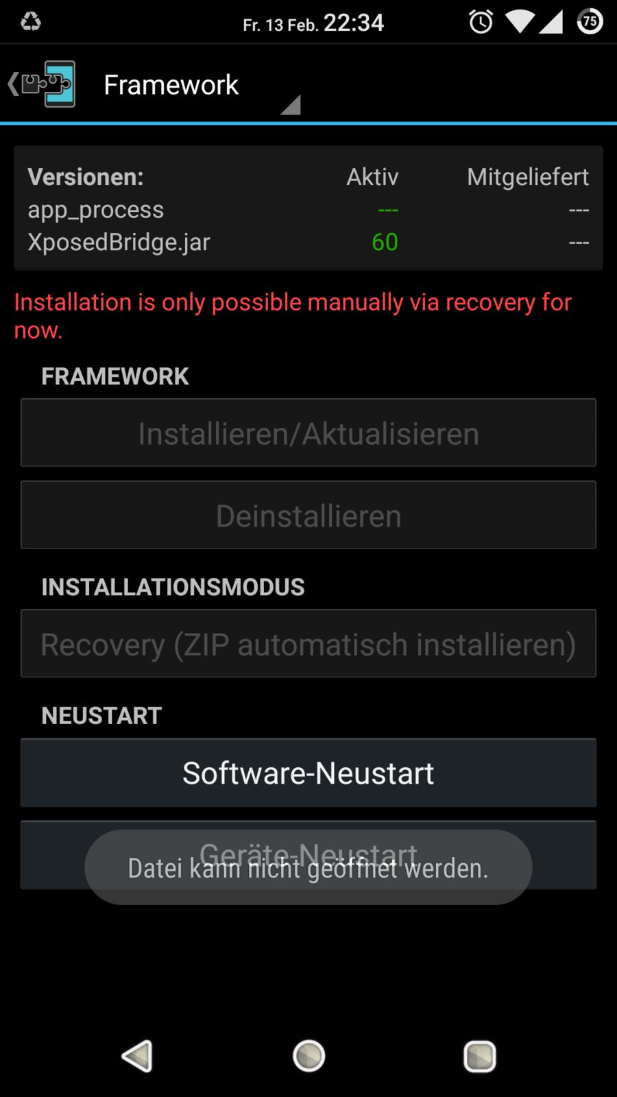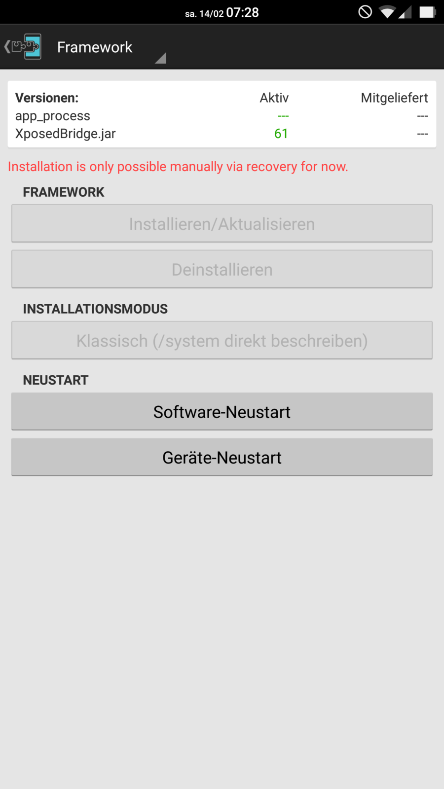 Zitat- If you have downloaded the files within the first hour, your phone boots but the installer says that the framework is not installed, please download the updated version and flash again. XposedBridge version must be 61 afterwards.
