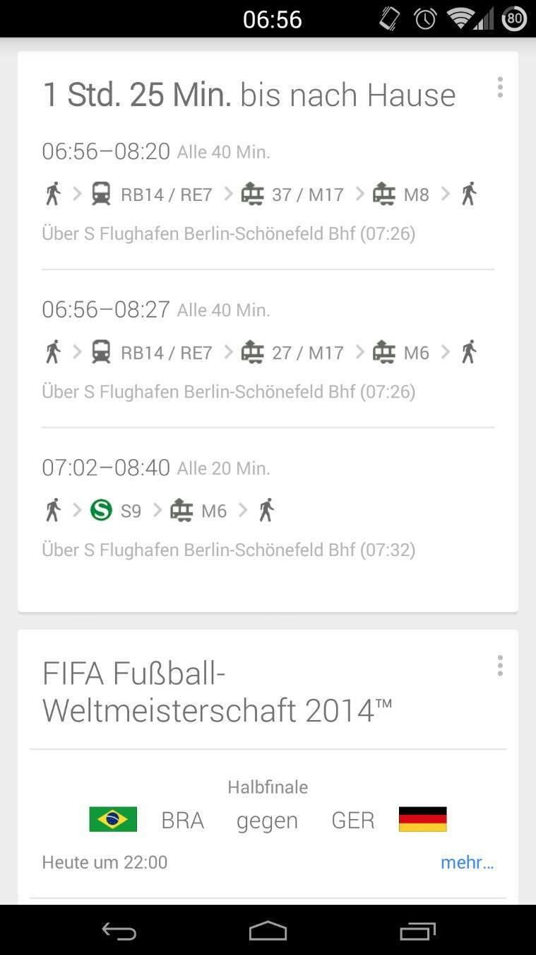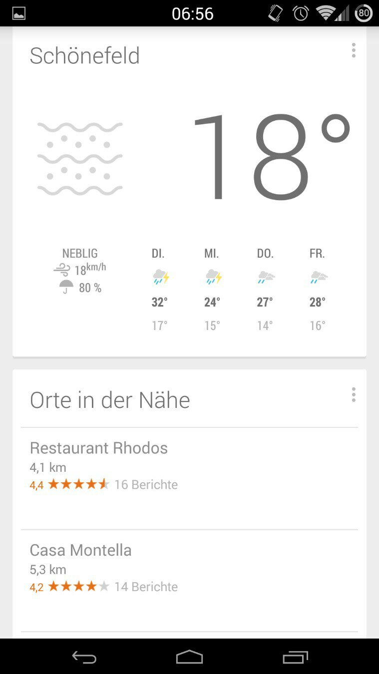 Google Now zeigt allgemeine Informationen wie Wetter und auch Verkehrslage zum jeweiligen Standort an, außerdem werden Termine aus dem Google Kalender ausgelesen und in Verbindung mit Verkehrsverbindung (z.Bsp.: Fluginfos, Öffis), Wetterinfos oder Location-Tipps angezeigt.