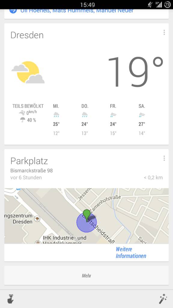 Für Autofahrer witzig, das Ding weiß, wo ich parke und ich könnte mich notfalls dahin navigieren lassen. Da ich aber gerade daheim bin, muss ich den Screenshot nachreichen, das wird nur an "fremden" Orten angezeigt.