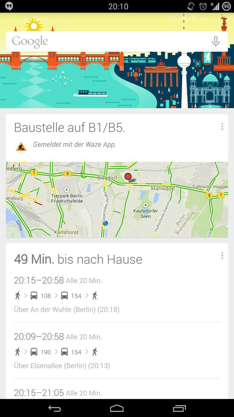 Google Now zeigt allgemeine Informationen wie Wetter und auch Verkehrslage zum jeweiligen Standort an, außerdem werden Termine aus dem Google Kalender ausgelesen und in Verbindung mit Verkehrsverbindung (z.Bsp.: Fluginfos, Öffis), Wetterinfos oder Location-Tipps angezeigt.