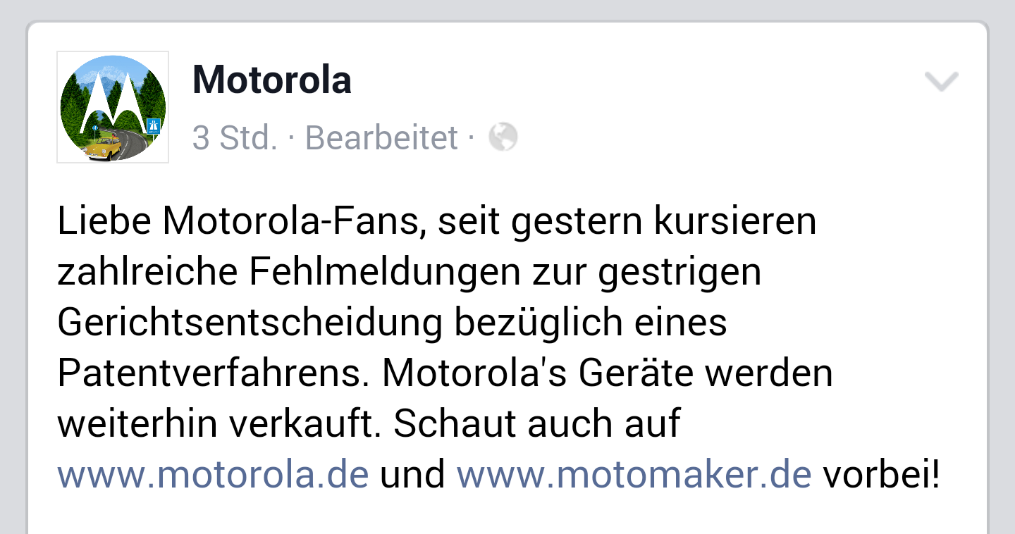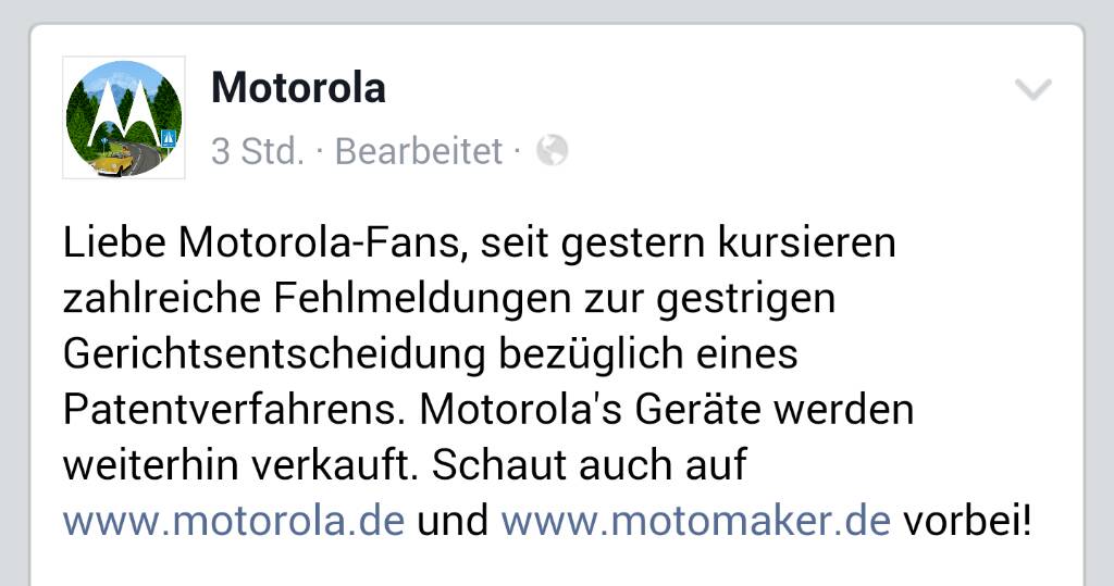 Bis zur Berufung ist der Verkauf somit erstmal gestoppt und dürfte ein herber Rückschlag sein für Motorola, die ja gerade mit Ihrer Moto-Maker-Seite und dem Moto X groß durchstarten wollten.