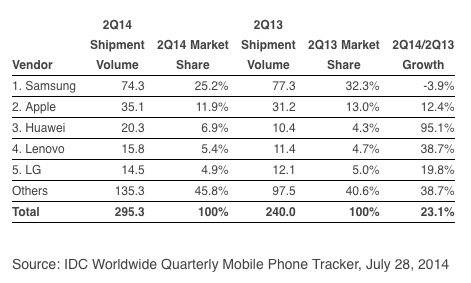 Die Verkaufszahlen vom 2.Quartal 2014 sind da und man sieht das der Smartphon- Weltmarkt stetig zunimmt, im Vergleich zum Vorjahr gibt es ein Plus von 23%. Die Iphone-Schmiede Apple konnte dem Trend nicht ganz folgen, nur 12,4% Zuwachs und Samsung hatte sogar ein Rückgang von 3,9% zu verzeichnen.