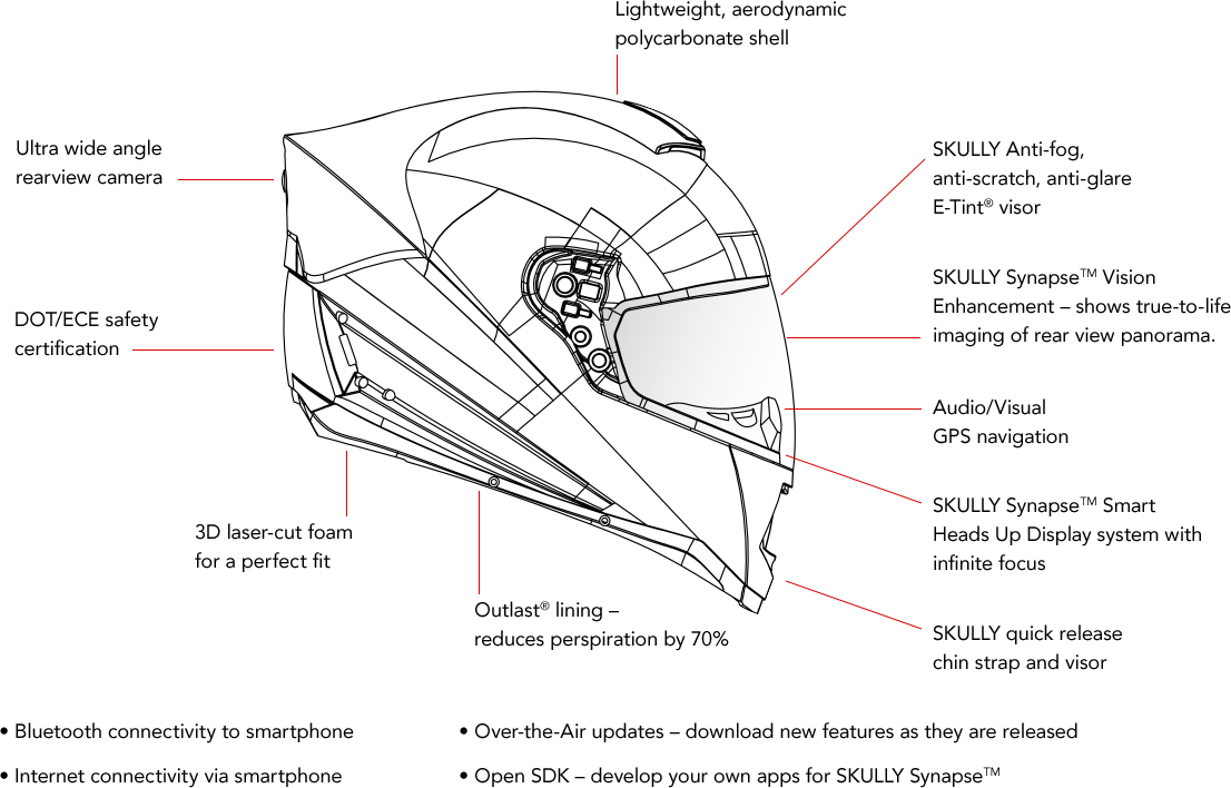 In der Rückseite des Helmes ist eine 180-Grad Kamera eingebaut, damit weiß der Fahrer immer wie der Verkehr hinter ihm aussieht, das Bild der Kamera wird auf einem transparenten Display, was sich hinter dem Visier befindet, angezeigt.