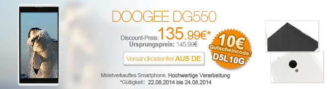 Endlich ist es soweit und es gibt das beliebte Doogee550 ab sofort mit einem Versand aus Deutschland. Um das Gebührend zu feiern gibt es einen 10€ Gutschein für den Kauf des Doogee550.
