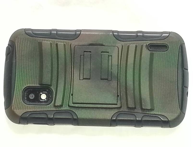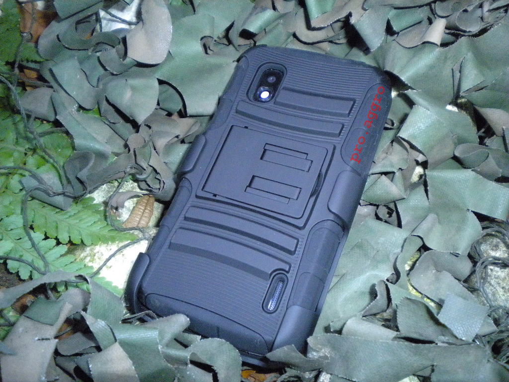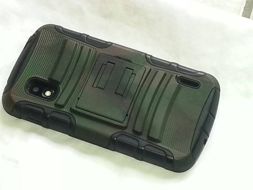 Das Case besteht aus einer Silikonhülle mit Verschlüssen für Audio- und USB-Buchse, einem Plastikcover mit Kickstand und einem Holster mit Clip.