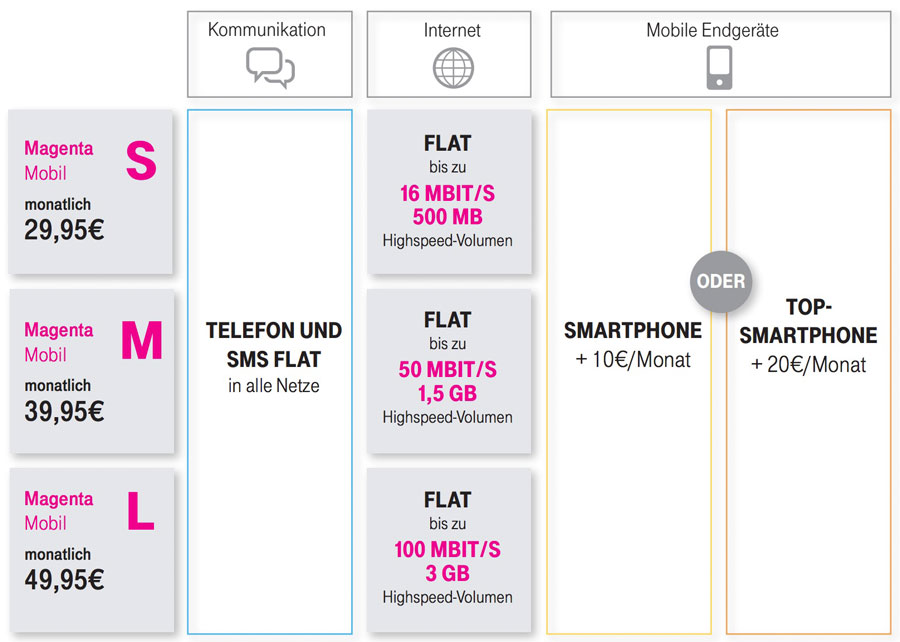 Der Kleinste kostet 30 Euro monatlich. Darunter die oben genannten Flatrates, sowie 500 MB Datenvolumen und ein Download von bis zu 16 Mbit/s.