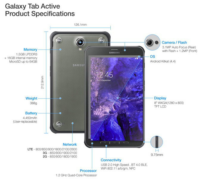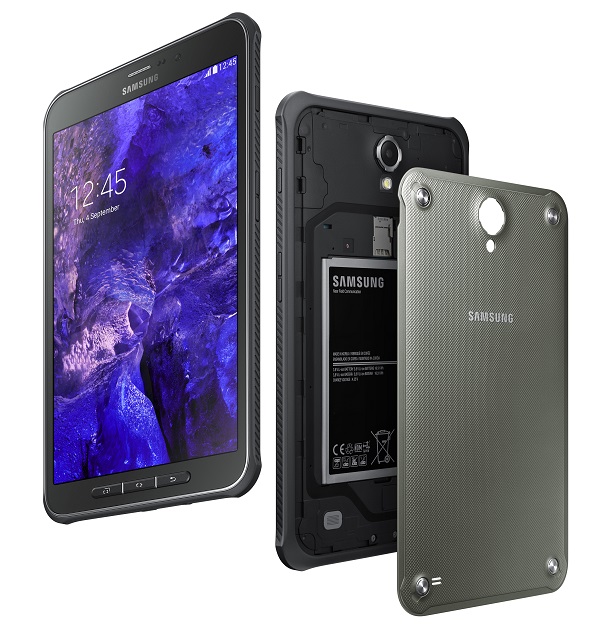 Samsung hat heute auf der zweiten Pressekonferenz noch ein weiteres neues Tablet vorgestellt, dass Galaxy Tab Active. Hierbei handelt es sich um ein robustes 8 Zoll Tablet, was wohl besonders für den Outdoor-Bereich oder für harte Bedingungen geschaffen wurde. Das Tab ist somit selbstverständlich nach IP67-Standard zertifiziert und gegen Wasser und Staub geschützt. Es soll sogar Stürze aus einer Höhe von bis zu 1,2 Metern problemlos überstehen. Geschützt wird das Tablet von einer dicken Gummi-Hülle, die an den wichtigsten Stellen zusätzliche Sicherheit bei einem Sturz bringen soll.