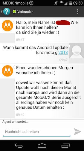 Laut Aussage des Motorola-Supports dann soll das Moto X und Moto G noch im September ein Update auf Android L bekommen. Sehr interessant, da es noch nicht mal von Google eine Finale Version gibt bzw. die Nexus-Geräte diese auch noch nicht offiziell erhalten haben. Ich zweifel auch an der Echtheit aber lassen wir uns mal überraschen.