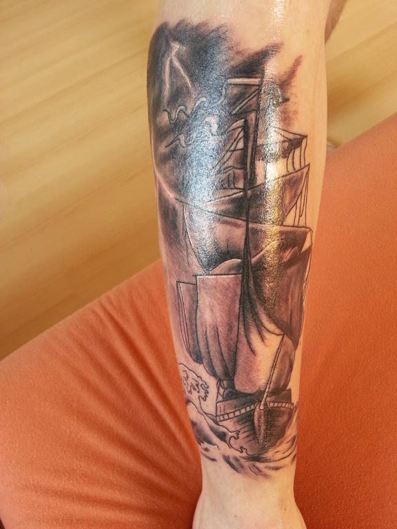 Auf der rechten Wade hab ich noch einen Leuchtturm mit Banderole, linke Wade eine Sanduhr mit Widmung für meinen besten Freund und auf dem linken Oberarm strahlt ein Erinnerungsstück aus der wilden Tresorzeit Mitte der 90er