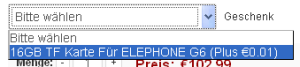 Einmalig zum Vorverkauf des Elephone G6 gibt es eine 16GB TF-Karte geschenkt. Diese Aktion ist nur für den Vorverkauf bis zum 09.10.2014 bestimmt. Danach gilt diese Aktion nicht mehr! Dabei müsst Ihr darauf achten, dass Ihr manuell die 16GB TF-Karte auch als Geschenk zu eurer Bestellung hinzufügt.