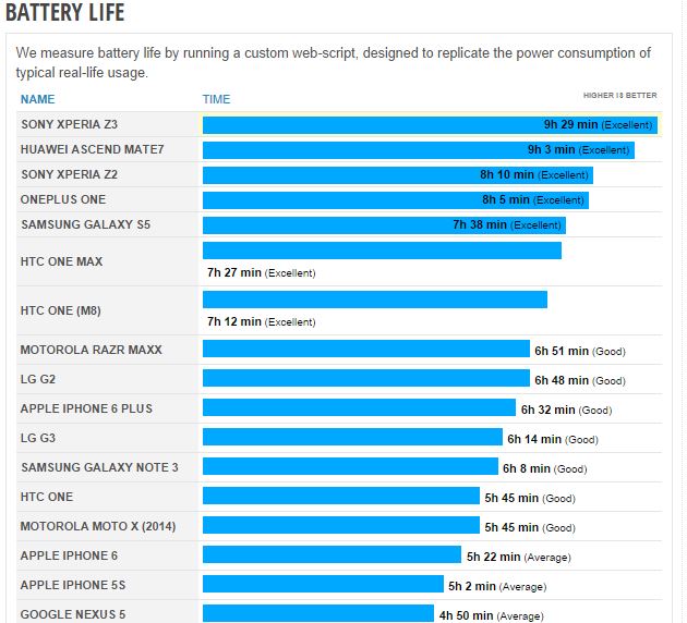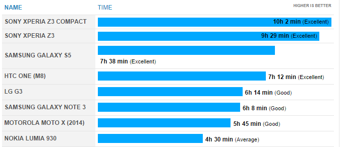 Wozu dann weitere News zu irgendwelchen Akkulaufzeiten? -Nun in diesem Fall stechen die Z3 wirklich erheblich aus der Masse hervor, weswegen ein News dazu mit Sicherheit berechtigt ist. Die Modelle der Sony Xperia Z3 Serie brechen hier aktuell alle Rekordwert in Sachen Akkulaufzeit. Laut einem Akkutest von Phone Arena konnte das Xperia Z3 sich mit einer Laufzeit von mehr als 9 Stunden und das Xperia Z3 compact mit einer Laufzeit von 10,2 Stunden an die Spitze des Akku-Rankings katapultieren und lässt selbst das OnePlus One weit hinter sich. Einigermaßen mithalten kann hier nur das Huawei Ascend Mate7 aber das ist auf Grund der Größe des Gehäuses und des Akkus mit 4,100 mAH eigentlich etwas unfair.