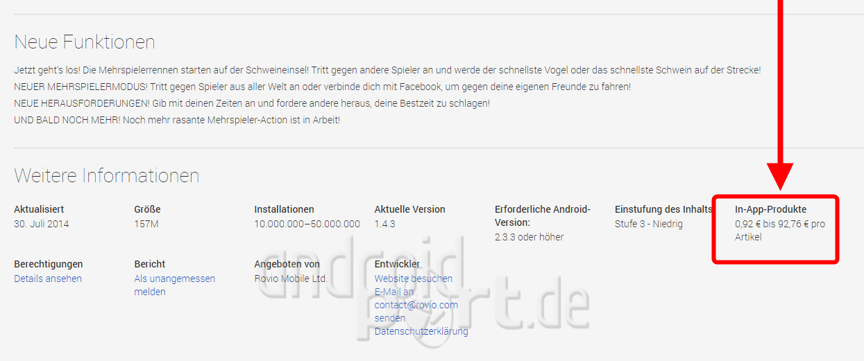 Dies hat nun Google zumindest ein wenig verbessert. Die Informationen zu den In-App-Käufen sind über die Browserversion des PlayStores jetzt recht gut erkennbar. Man muss allerdings recht weit nach unten scrollen bis zu den Versions-, Größen- und Download-Angaben etc. Des Weiteren wird nun auch die vollständige Adresse des/der Entwicklers angezeigt.