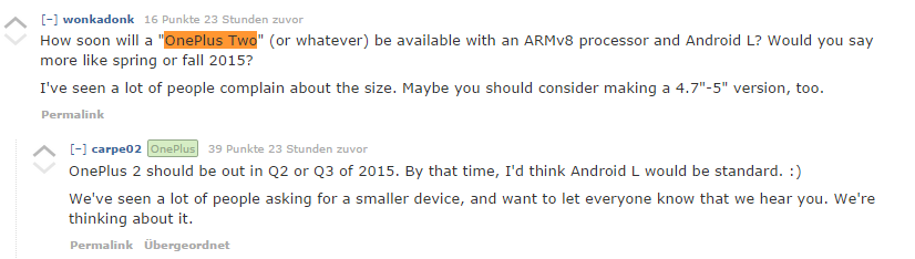 Der Nachfolger soll OnePlus Two heißen und soll im zweiten oder dritten Quartal 2015 erscheinen. Höchst wahrscheinlich wird dann auch Android L mit an Bord sein. Auf eine Frage eines Users, ob es das Gerät nicht auch kleiner geben kann (4,7-5 Zoll) antwortete man, dass man darüber nachdenken werden.