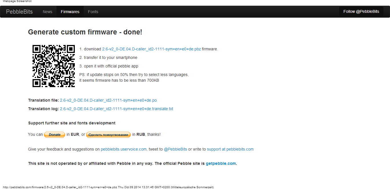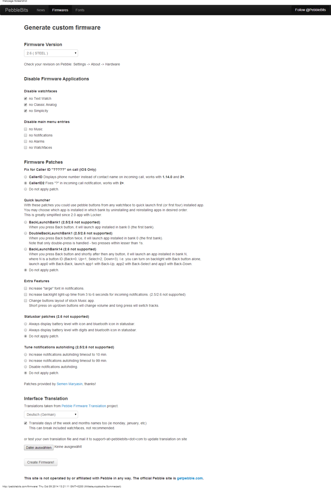 Auf der Seite von Pebblebits könnt ihr euch eine Custom-Firmware erstellen wo ihr z.B. die Standard-Watchfaces entfernen könnt oder aber eine komplett deutsche Firmware generieren lassen könnt.