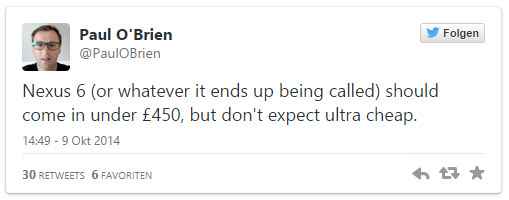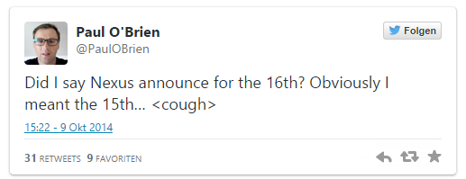 Des Weiteren sollen die neuen Nexus Geräte bereits am 15.10.2014 vorgestellt werden und nicht wie vorher angedeutet am 16.10. wie jetzt Paul O'Brien (arbeitet bei MoDaCo) per Twitter mitteilte