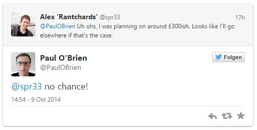 Ein Twitter-Nutzer fragte darauf ob es denn für um die 300 Pfund (381 Euro) erhältlich sein würde aber er antwortet darauf nur kurz mit „keine Chance”.