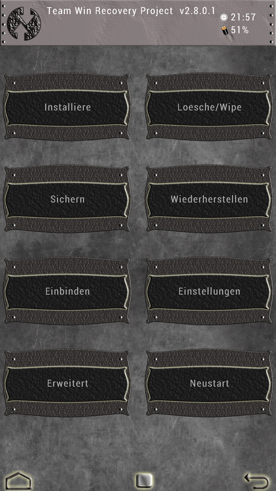 [COLOR=Red]Dies ist zwar nur ein Theme für TWRP, aber ich schreibe es trotzdem. Benutzung auf eigene Gefahr. Also weder android-port.de noch ich übernehmen irgendwelche Haftungen bei Schäden![/COLOR]