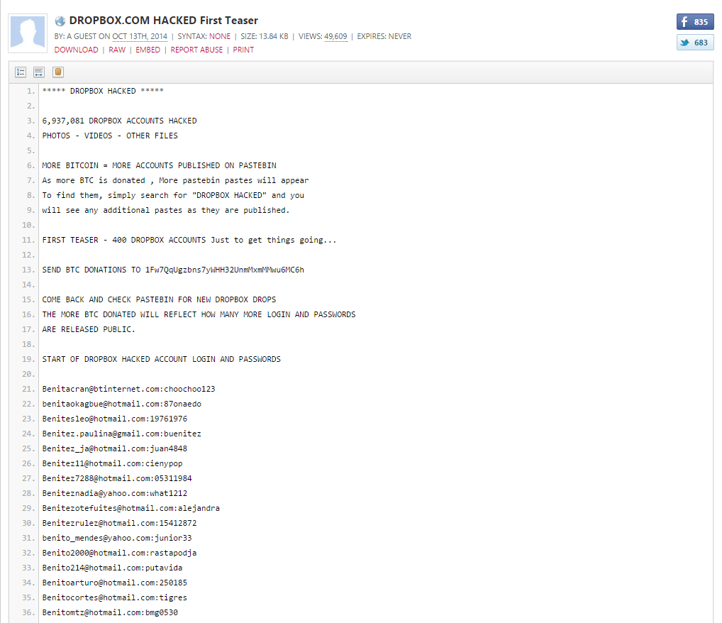 Es sollen laut unbekannten Hackern rund sieben Millionen Dropbox Nutzerprofile gestohlen worden sein. Dropbox weist jegliche Schuld von sich und behauptet die Daten wurden durch externen Dienste/Apps, die mit der Dropbox verbunden wurden, erbeutet.