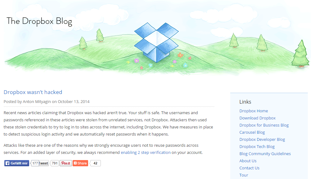 Dropbox teilt nun in einer Stellungnahme mit, dass der Cloudspeicher-Dienst selbst, nicht gehackt worden sei. Die Benutzernamen und Passwörter wurden angeblich über unsichere Anwendungen erbeutet.