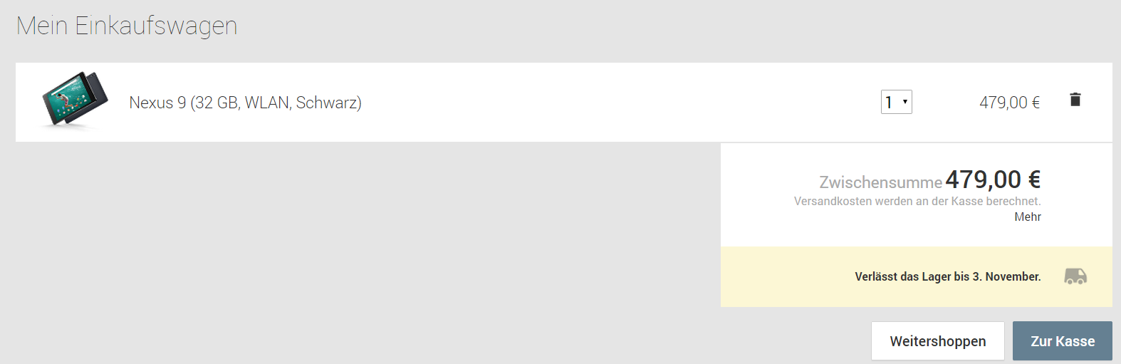 Während man das Tablet ab sofort im Play Store ergattern kann, ist bei Amazon dagegen eine Verzögerung der Lieferzeit zu beobachten: Während dort die schwarze Variante mit 32 GB ab dem 9. November verfügbar sein soll, wird bei den anderen Geräten eine Lieferzeit von ein bis vier Monaten beziehungsweise dem 20. Dezember genannt. Nach wie vor fraglich bleibt außerdem der Launch-Termin für das Nexus 6, bei dem es zuletzt in den USA zuProblemen bei der Verfügbarkeit gab.► Nexus 9 (WLAN) im Google Play Store kaufen