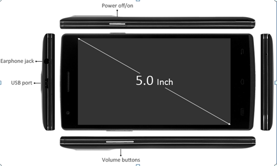 Wie bei den meisten Smartphones handelt es sich auch bei diesem um einem USB Port. Links befindet sich der Power Knopf und rechts die Lautstärkenregulierung. Das Display umfasst 5.0 Zoll.