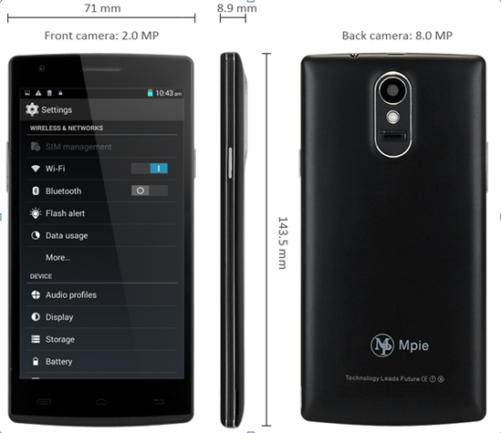 Das Smartlet von Mpie G7 hat eine Länge von 14,35 cm, die Breite umfasst 7,10 cm und eine Höhe von 0,89 cm. Die Rückkamera ist mit 8 MP und die Frontkamera mit 2 MP ausgestattet.