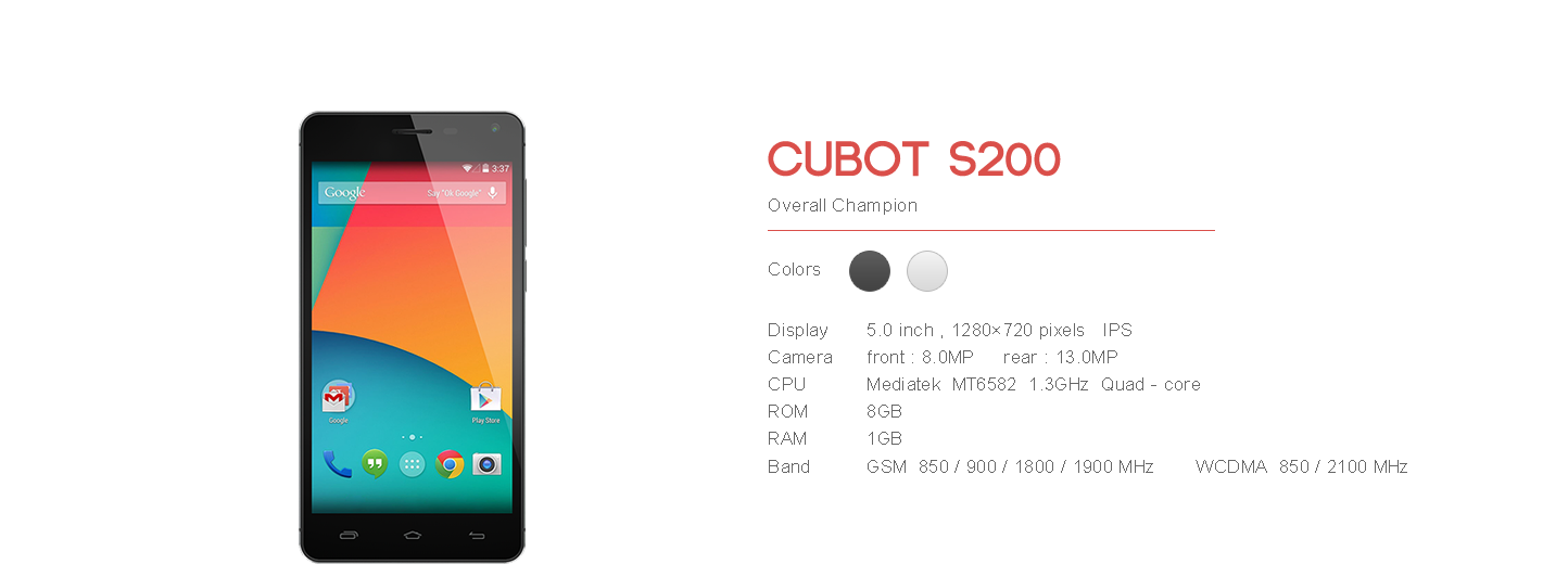 Der Bildschirm hat eine Auflösung von 1280 x 720 Pixel und ist ein IPS Schirm. Das Cubot S200 hat einen 1,3 GHz MT6582 Quad-Core Prozessor, 1 GB RAM und 8 GB ROM und wird mit Android 4.4 bestückt sein. HotKnot, OTG, Smartwake und andere Features sind selbstverständlich.