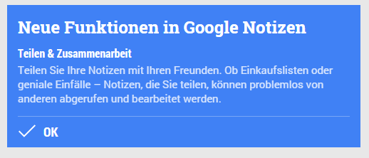 So wie die meisten Google Apps hat nun auch die hauseigene Notiz-App Keep ein Update erhalten. Die große Neuerung ist, dass man ab jetzt auch Notizen mit anderen Nutzern teilen und bearbeiten kann. Damit erhält Keep endlich eine wichtige und nützliche Funktion, die irgendwie gefehlt hat. Nun ist das Feature aber da und man kann gemeinsam Notizen oder Listen bearbeiten. Beispiele hier für könnte z.B. eine Einkaufsliste o.ä. sein. Die Informationen werden in Echtzeit syncronisiert sobald von einem Nutzer eine Veränderung vorgenommen wird.