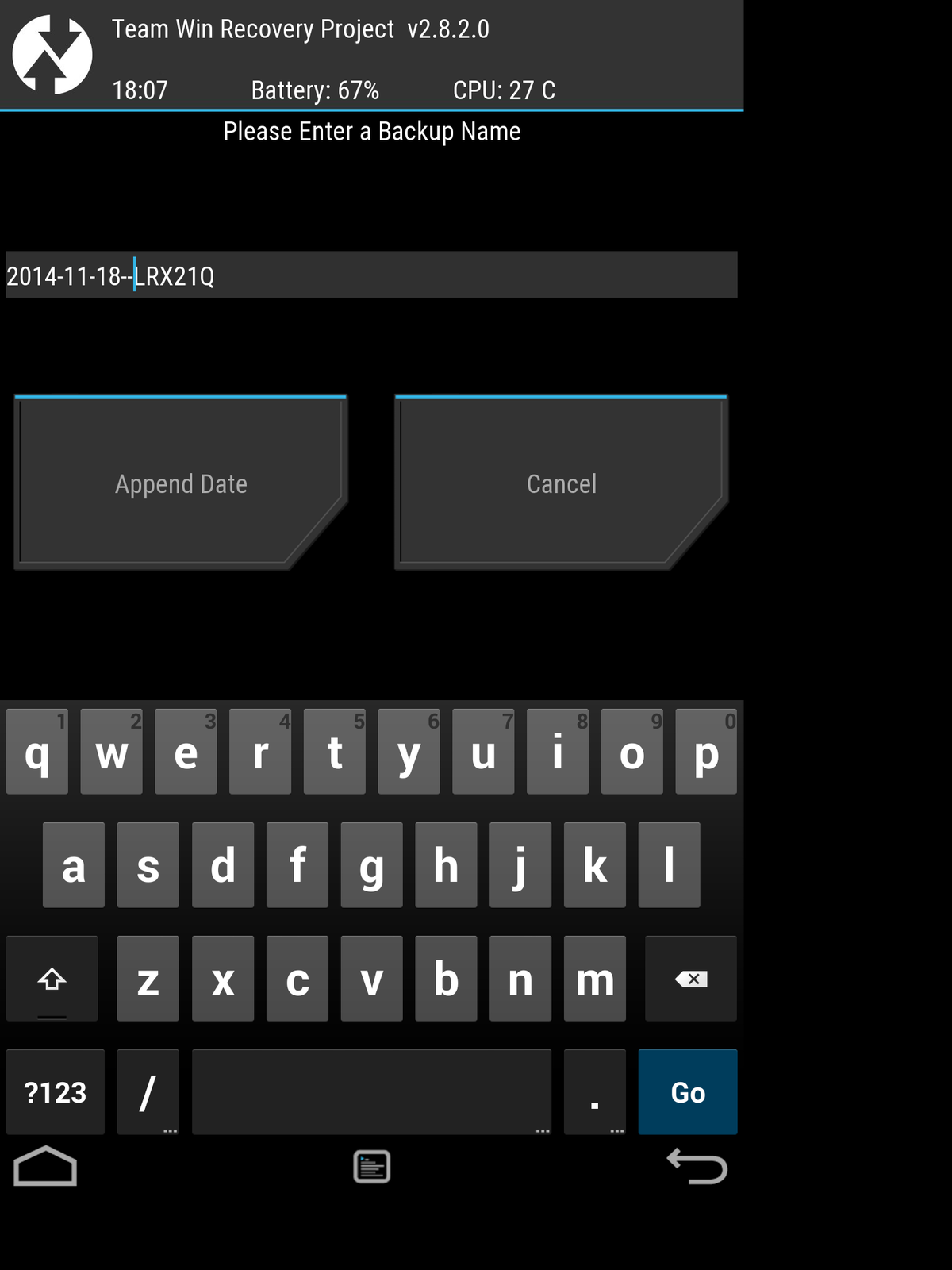 7 8 9So an upper-case L would translate to a password of 14789 entered on the keyboard. Eventually we plan to add a proper pattern unlock to TWRP but it is a relatively low priority at this point.